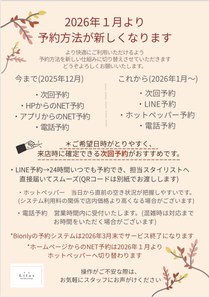 またご来店いただいた際に説明をさせて頂きますが、今のNET予約とアプリ予約のサービスが3月末で終了してしまいますので、その点だけご了承ください。